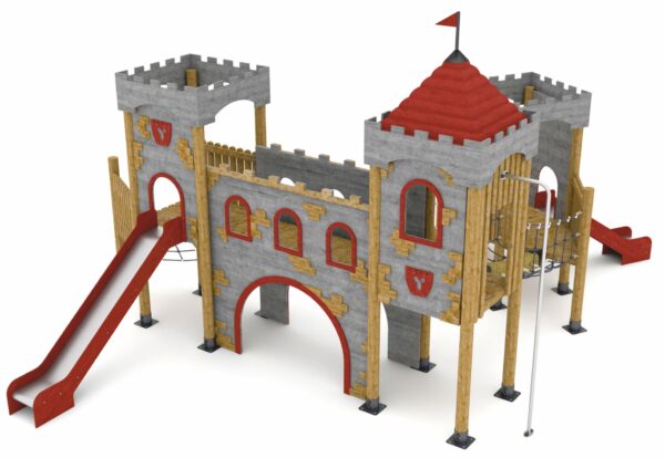 Acoperisul, panourile decorative si lateraleler toboganelor sunt din HDPE. Partea alunecoasa a toboganelor e realizata din tabla din Inox.